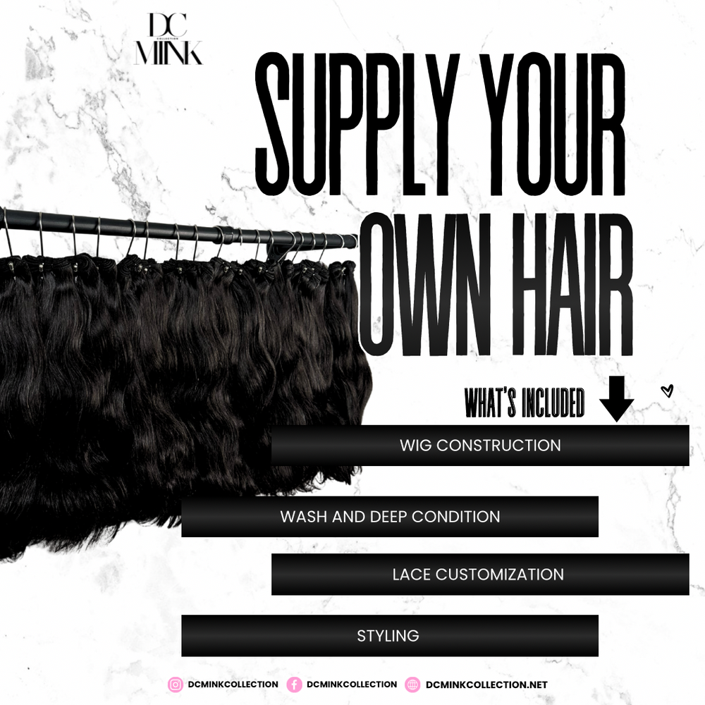 Supply Your Own Hair allows you to bring in your own lace and bundles to be fully customized. This service includes complete wig construction on a sewing machine, bleached knots, plucking, optional baby hairs, and styling. Each unit is meticulously customized and delivered ready to wear.